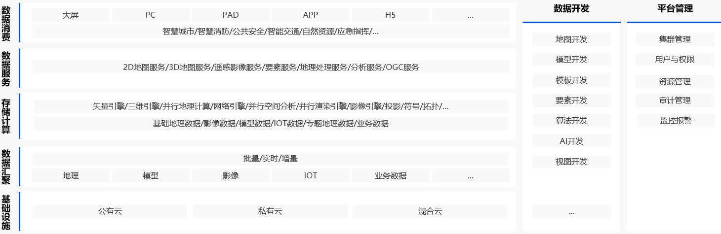 提供数据汇聚、全空间数据管理、地图制作、二三维要素制作、全空间数据分析、AI智能分析、全空间一体化渲染与可视化等能力。