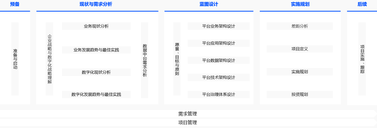 明确数据中台的需求,设计数据中台的业务架构、数据架构、应用架构、技术架构及治理体系,规划数据中台的实施路径、投资等
